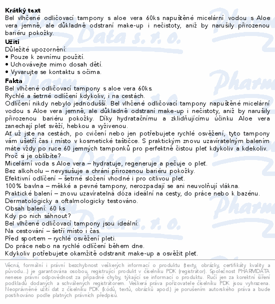 Bel vlhčené odličovací tampony s aloe vera 60ks napuštěné micelární vodou s Aloe vera jemně, ale důkladně odstraní make-up i nečistoty, aniž by narušily přirozenou bariéru pokožky.