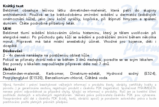 Beldimet obsahuje léčivou látku dimetinden-maleinát, která patří do skupiny antihistaminik. Používá se ke krátkodobému zmírnění svědění u dermatóz (svědivých onemocnění kůže), jako jsou kožní vyrážky, kopřivka, při štípnutí hmyzem a spálení sluncem. Čtěte pozorně příbalový leták.