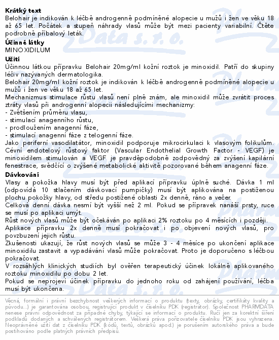 Belohair je indikován k léčbě androgenně podmíněné alopecie u mužů i žen ve věku 18 až 65 let. Počátek a stupeň náhrady vlasů může být mezi pacienty variabilní. Čtěte pozorně příbalový leták.