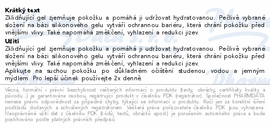 Zklidňující gel zjemňuje pokožku a pomáhá ji udržovat hydratovanou. Pečlivě vybrané složení na bázi silikonového gelu vytváří ochrannou bariéru, která chrání pokožku před vnějšími vlivy. Také napomáhá změkčení, vyhlazení a redukci jizev.