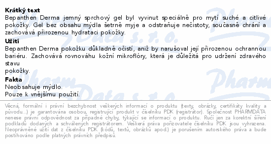Bepanthen Derma jemný sprchový gel byl vyvinut speciálně pro mytí suché a citlivé pokožky. Gel bez obsahu mýdla šetrně myje a odstraňuje nečistoty, současně chrání a zachovává přirozenou hydrataci pokožky.
