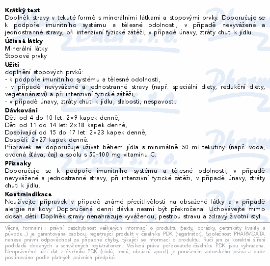 Doplněk stravy v tekuté formě s minerálními látkami a stopovými prvky. Doporučuje se k podpoře imunitního systému a tělesné odolnosti, v případě nevyvážené a jednostranné stravy, při intenzivní fyzické zátěži, v případě únavy, ztráty chuti k jídlu.