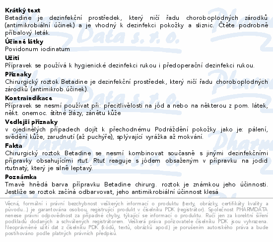 Betadine je dezinfekční prostředek, který ničí řadu choroboplodných zárodků (antimikrobiální účinek) a je vhodný k dezinfekci pokožky a sliznic. Čtěte pozorně příbalový leták.