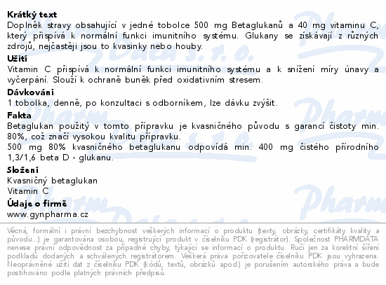 Doplněk stravy obsahující v jedné tobolce 500 mg Betaglukanů a 40 mg vitaminu C, který přispívá k normální funkci imunitního systému. Glukany se získávají z různých zdrojů, nejčastěji jsou to kvasinky nebo houby.