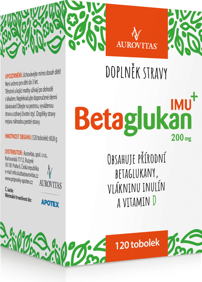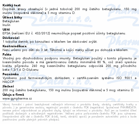 Doplněk stravy obsahující (v jedné tobolce) 200 mg čistého betaglukanu, 150 mg inulinu (rozpustná vláknina) a 5 mcg vitaminu D.