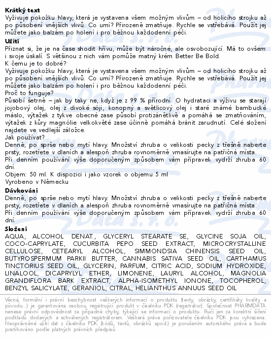 Vyživuje pokožku hlavy, která je vystavena všem možným vlivům – od holicího strojku až po působení vnějších vlivů. Co umí? Přirozeně zmatňuje. Rychle se vstřebává. Použít jej můžete jako balzám po holení i pro běžnou každodenní péči.