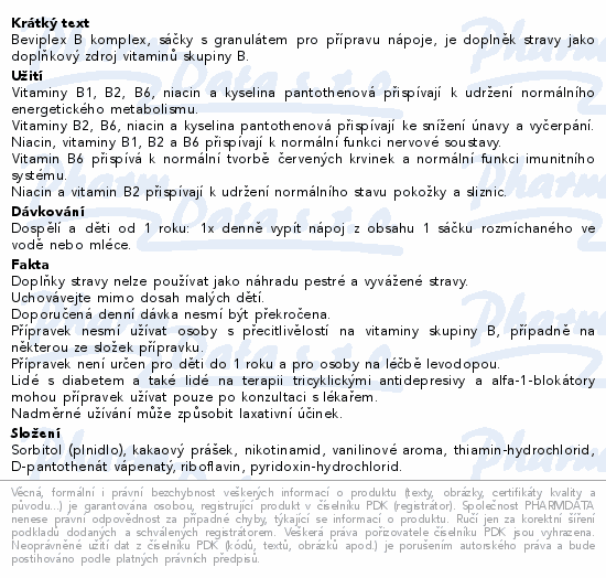 Beviplex B komplex, sáčky s granulátem pro přípravu nápoje, je doplněk stravy jako doplňkový zdroj vitaminů skupiny B.