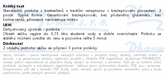 Standardní polévka z bestsellerů s tradiční recepturou v bezlepkovém provedení. 3 porce. Sypká forma. Garantování bezlepkovosti, bez přidaného glutamátu, bez konzervantů, přirozeně neobsahuje mléko.