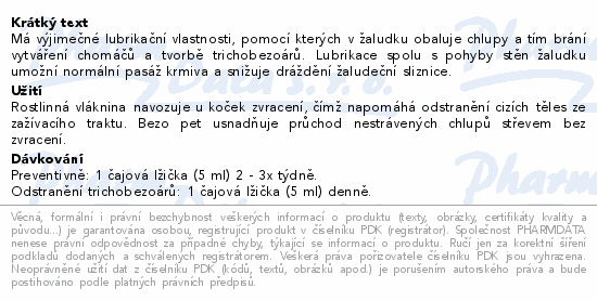 Má výjimečné lubrikační vlastnosti, pomocí kterých v žaludku obaluje chlupy a tím brání vytváření chomáčů a tvorbě trichobezoárů. Lubrikace spolu s pohyby stěn žaludku umožní normální pasáž krmiva a snižuje dráždění žaludeční sliznice.
