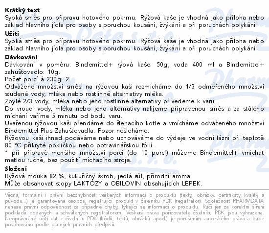 Sypká směs pro přípravu hotového pokrmu. Rýžová kaše je vhodná jako příloha nebo základ hlavního jídla pro osoby s poruchou kousání, žvýkání a při poruchách polykání.
