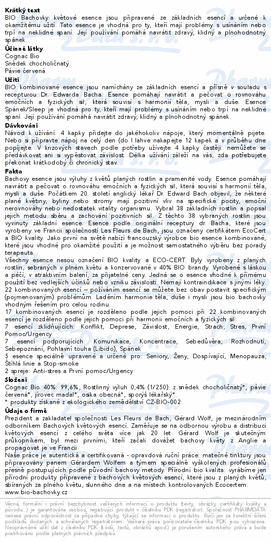 BIO Bachovky květové esence jsou připravené ze základních esencí a určené k okamžitému užití. Tato esence je vhodná pro ty, kteří mají problémy s usínáním nebo trpí na neklidné spaní. Její používání pomáhá navrátit zdravý, klidný a plnohodnotný spánek.