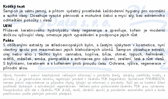 Šampon je velmi jemný, a přitom vydatný prostředek každodenní hygieny pro normální a suché vlasy. Dosahuje vysoké pěnivosti a mohutné čisticí a mycí síly, bez extrémního odmaštění pokožky i vlasů.