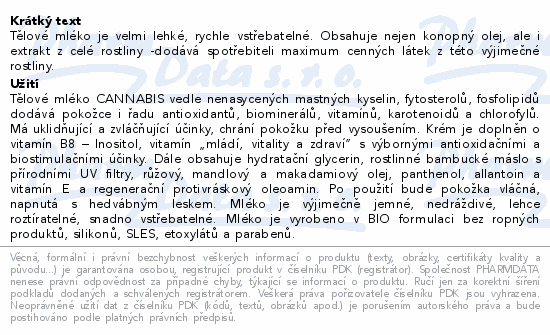 Tělové mléko je velmi lehké, rychle vstřebatelné. Obsahuje nejen konopný olej, ale i extrakt z celé rostliny -dodává spotřebiteli maximum cenných látek z této výjimečné rostliny.