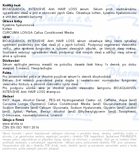 BIOAQUANOL INTENSIVE Anti HAIR LOSS serum. Sérum proti nadměrnému vypadávání vlasů a pro a obnovení jejich růstu. Obsahuje kofein, kyselinu hyaluronovou a unikátní extrakt kurkumy.
