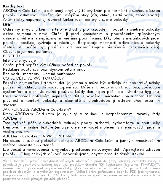 ABCDerm Cold-krém je ochranný a výživný tělový krém pro normální a suchou dětskou pokožku oslabenou nepříznivými vnějšími vlivy (vítr, chlad, tvrdá voda, teplo apod.). Aktivní látky napomáhají obnovit funkci kožní bariéry u suché pokožky.