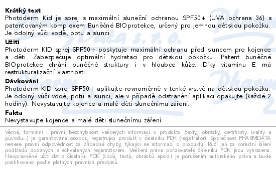 Photoderm Kid je sprej s maximální sluneční ochranou SPF50+ (UVA ochrana 36) s patentovaným komplexem Buněčné BIOprotekce, určený pro jemnou dětskou pokožku. Je odolný vůči vodě, potu a slunci.