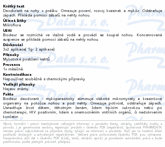Deodorant na nohy v prášku. Omezuje pocení, rozvoj kvasinek a mykóz. Odstraňuje zápach. Přikládá pomocí zábalů na nehty nohou.
