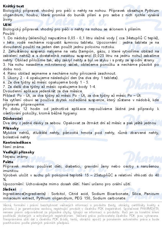 Biologický přípravek vhodný pro péči o nehty na nohou. Přípravek obsahuje Pythium oligandrum, houbu, která proniká do buněk plísní a pro sebe z nich rychle vysává živiny.