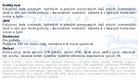 Exkluzivní řada ovocných, bylinných a pravých porcovaných čajů plných rozmanitých chutí a vůní pro chvíle pohody i slavnostních okamžiků. Vyberte si z lákavých kombinací ovoce a bylin.