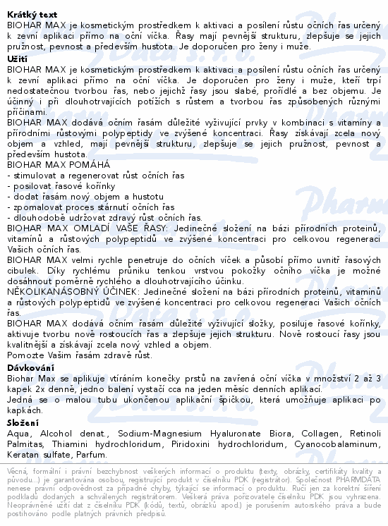 BIOHAR MAX je kosmetickým prostředkem k aktivaci a posílení růstu očních řas určený k zevní aplikaci přímo na oční víčka. Řasy mají pevnější strukturu, zlepšuje se jejich pružnost, pevnost a především hustota. Je doporučen pro ženy i muže.