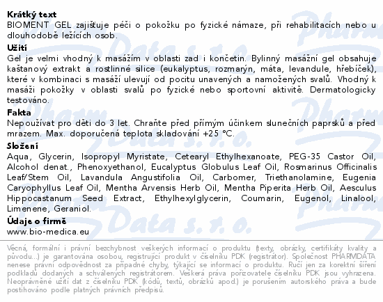 BIOMENT GEL zajišťuje péči o pokožku po fyzické námaze, při rehabilitacích nebo u dlouhodobě ležících osob.