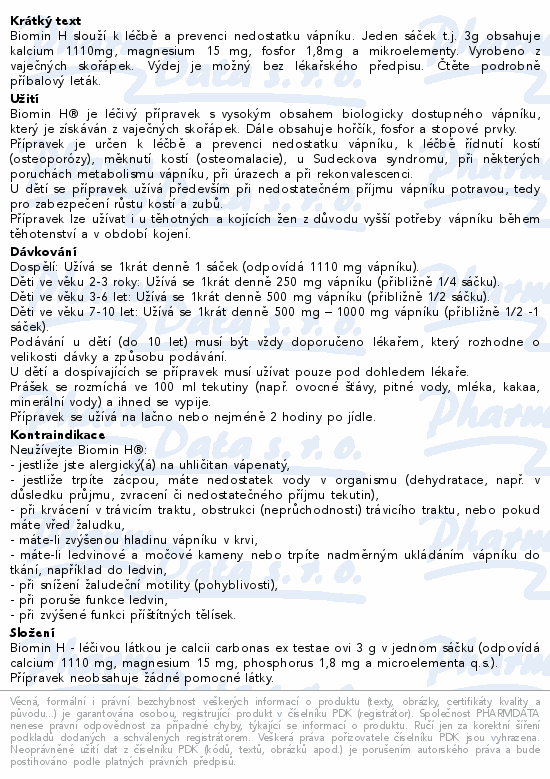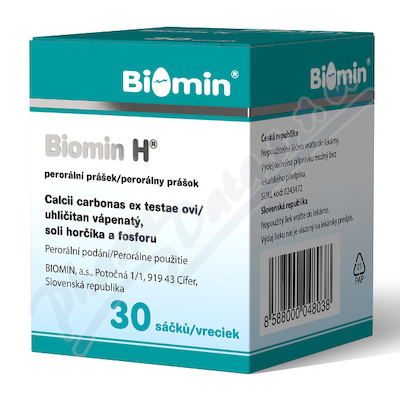 Biomin H slouží k léčbě a prevenci nedostatku vápníku. Jeden sáček t.j. 3g obsahuje kalcium 1110mg, magnesium 15 mg, fosfor 1,8mg a mikroelementy. Vyrobeno z vaječných skořápek. Výdej je možný bez lékařského předpisu. Čtěte pozorně příbalový leták.