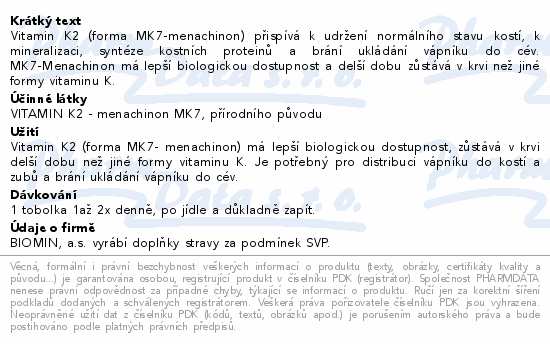 Vitamin K2 (forma MK7-menachinon) přispívá k udržení normálního stavu kostí, k mineralizaci, syntéze kostních proteinů a brání ukládání vápníku do cév. MK7-Menachinon má lepší biologickou dostupnost a delší dobu zůstává v krvi než jiné formy vitaminu K.