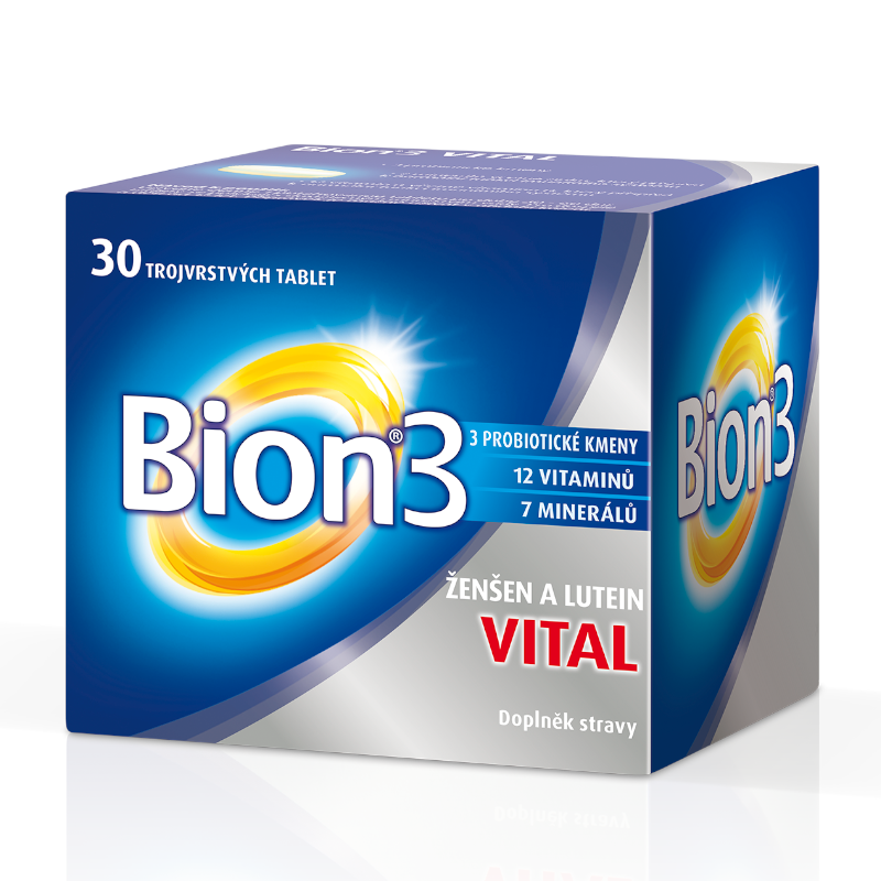 Bion 3 Vital je doplněk stravy, který obsahuje 3 probiotické kmeny, 12 vitaminů (včetně vitaminu D) a 7 minerálů (včetně zinku), ženšen a lutein. Tento doplněk stravy je ve formě trojvrstvých tablet.
