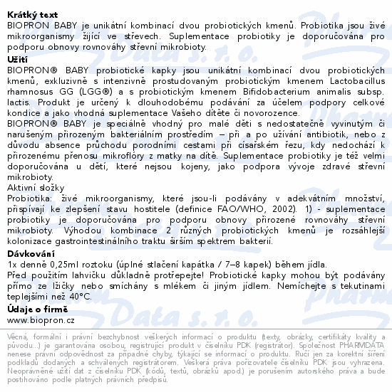 BIOPRON BABY je unikátní kombinací dvou probiotických kmenů. Probiotika jsou živé mikroorganismy žijící ve střevech. Suplementace probiotiky je doporučována pro podporu obnovy rovnováhy střevní mikrobioty.