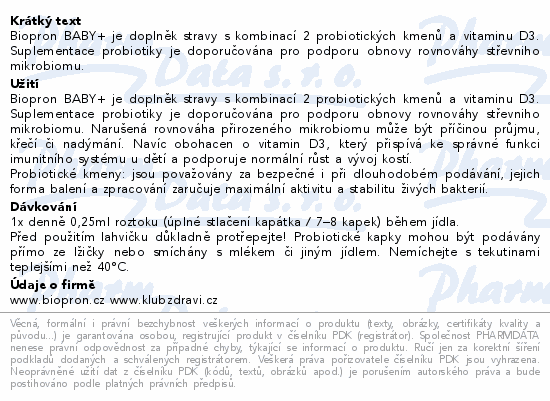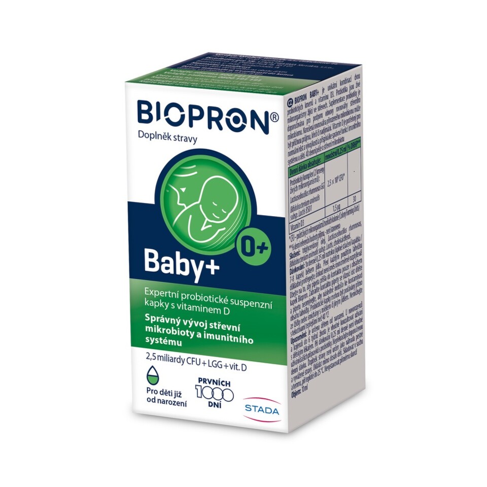 Biopron BABY+ je doplněk stravy s kombinací 2 probiotických kmenů a vitaminu D3. Suplementace probiotiky je doporučována pro podporu obnovy rovnováhy střevniho mikrobiomu.
