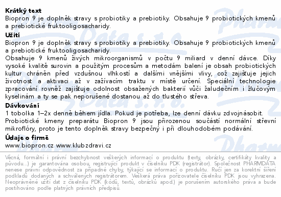 Walmark Biopron9 je doplněk stravy, který obsahuje komplexní probiotický preparát - 9 kmenů vitálních mikroorganismů v koncentraci 9 miliard v denní dávce v kombinaci s prebiotiky.