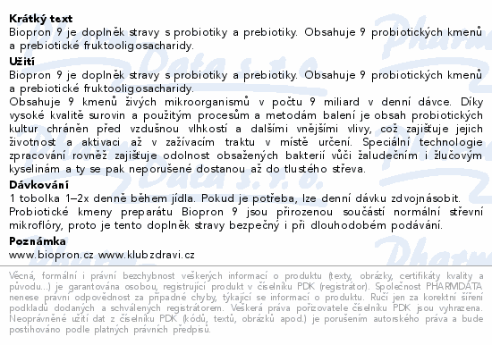 Walmark Biopron9 je doplněk stravy, který obsahuje komplexní probiotický preparát - 9 kmenů vitálních mikroorganismů v koncentraci 9 miliard v denní dávce v kombinaci s prebiotiky.