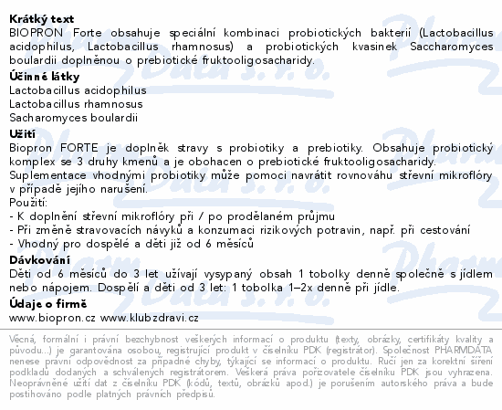 BIOPRON Forte obsahuje speciální kombinaci probiotických bakterií (Lactobacillus acidophilus, Lactobacillus rhamnosus) a probiotických kvasinek Saccharomyces boulardii doplněnou o prebiotické fruktooligosacharidy.