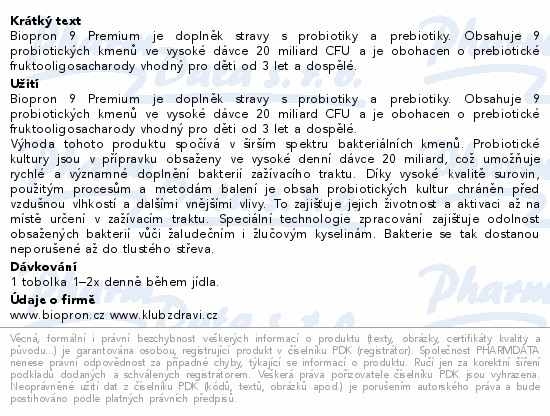 Biopron9 PREMIUM je doplněk stravy ve formě tobolek, který obsahuje kombinaci 9 probiotických kmenů v maximální koncentraci 20 miliard v denní dávce. Je vhodný zejména při a po užívání antibiotik a určený je pro dospělé a děti od 3 let. Vhodný také pro kojící a těhotné ženy.