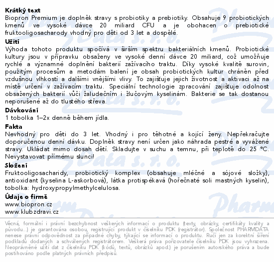 Biopron Premium je doplněk stravy s probiotiky a prebiotiky. Obsahuje 9 probiotických kmenů ve vysoké dávce 20 miliard CFU a je obohacen o prebiotické fruktooligosacharody vhodný pro děti od 3 let a dospělé.