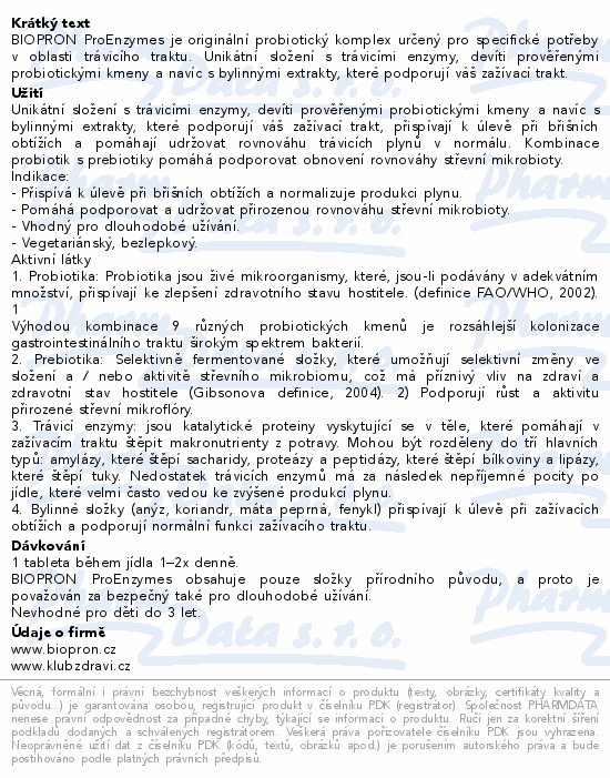 BIOPRON ProEnzymes je originální probiotický komplex určený pro specifické potřeby v oblasti trávicího traktu. Unikátní složení s trávicími enzymy, devíti prověřenými probiotickými kmeny a navíc s bylinnými extrakty, které podporují váš zažívací trakt.