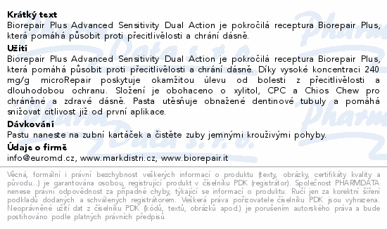 Biorepair Plus Advanced Sensitivity Dual Action je pokročilá receptura Biorepair Plus, která pomáhá působit proti přecitlivělosti a chrání dásně.