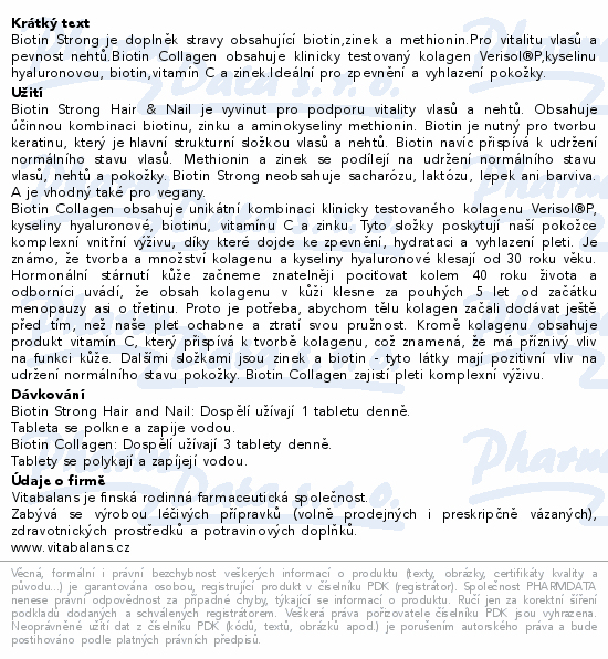 Biotin Strong je doplněk stravy obsahující biotin,zinek a methionin.Pro vitalitu vlasů a pevnost nehtů.Biotin Collagen obsahuje klinicky testovaný kolagen Verisol®P,kyselinu hyaluronovou, biotin,vitamín C a zinek.Ideální pro zpevnění a vyhlazení pokožky.