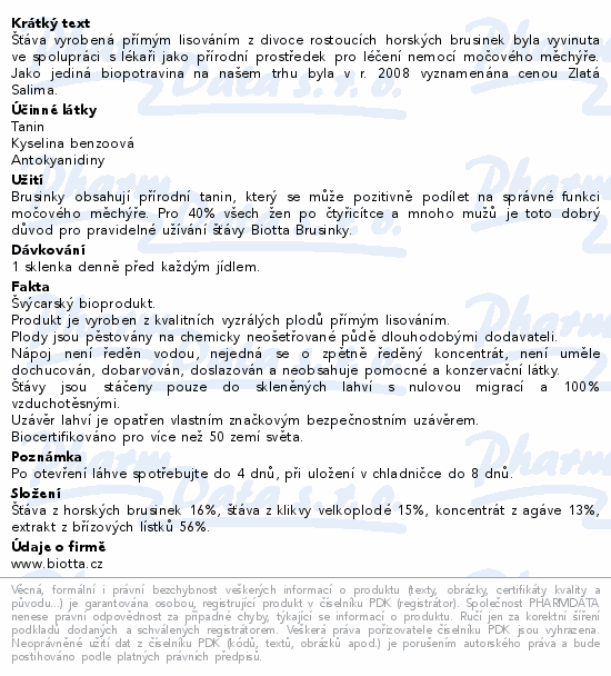 Šťáva vyrobená přímým lisováním z divoce rostoucích horských brusinek byla vyvinuta ve spolupráci s lékaři jako přírodní prostředek pro léčení nemocí močového měchýře. Jako jediná biopotravina na našem trhu byla v r. 2008 vyznamenána cenou Zlatá Salima.