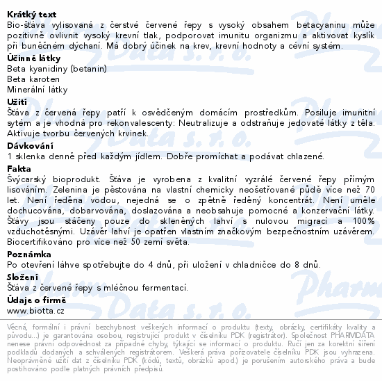 Bio-šťáva vylisovaná z čerstvé červené řepy s vysoký obsahem betacyaninu může pozitivně ovlivnit vysoký krevní tlak, podporovat imunitu organizmu a aktivovat kyslík při buněčném dýchaní. Má dobrý účinek na krev, krevní hodnoty a cévní systém.