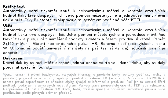 Automatický pažní tlakoměr slouží k neinvazivnímu měření a kontrole arteriálních hodnot tlaku krve dospělých lidí. Jeho pomocí můžete rychle a jednoduše měřit krevní tlak a puls. Díky Bluetooth spolupracuje se systémem vzdálené péče ISTEL.