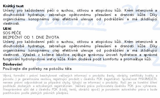 Určený pro každodenní péči o suchou, citlivou a atopickou kůži. Krém intenzivně a dlouhodobě hydratuje, zabraňuje opětovnému přesušení a drsnosti kůže. Díky organickému konopnému oleji efektivně ulevuje od podráždění a má zklidňující vlastnosti.