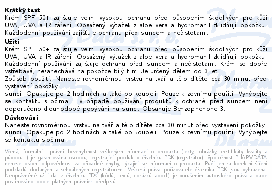 Krém SPF 50+ zajišťuje velmi vysokou ochranu před působením škodlivých pro kůži UVA, UVA a IR záření. Obsažený výtažek z aloe vera a hydromanil zklidňují pokožku. Každodenní používání zajišťuje ochranu před sluncem a nečistotami.