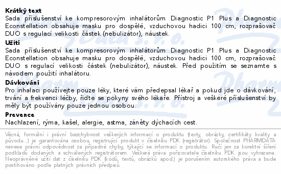 Sada příslušenství ke kompresorovým inhalátorům Diagnostic P1 Plus a Diagnostic Econstellation obsahuje masku pro dospělé, vzduchovou hadici 100 cm, rozprašovač DUO s regulací velikosti částek (nebulizátor), náustek.