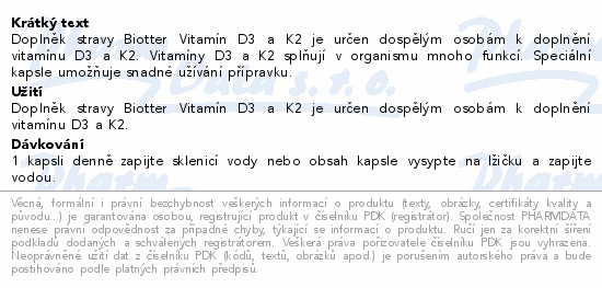 Doplněk stravy Biotter Vitamín D3 a K2 je určen dospělým osobám k doplnění vitamínu D3 a K2. Vitamíny D3 a K2 splňují v organismu mnoho funkcí. Speciální kapsle umožňuje snadné užívání přípravku.