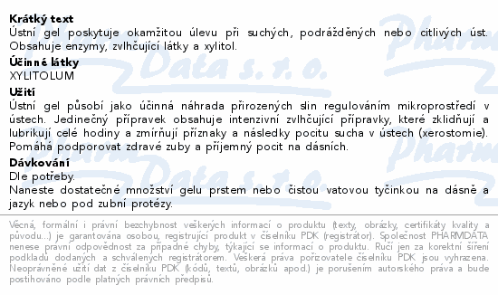 Ústní gel poskytuje okamžitou úlevu při suchých, podrážděných nebo citlivých úst. Obsahuje enzymy, zvlhčující látky a xylitol.