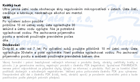 Ultra jemná ústní voda obohacuje sliny regulováním mikroprostředí v ústech. Ústa čistí, osvěžuje a lubrikuje, neobsahuje alkohol ani mentol.