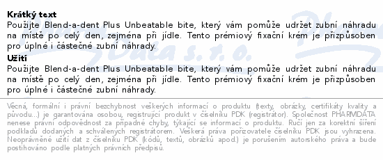 Použijte Blend-a-dent Plus Unbeatable bite, který vám pomůže udržet zubní náhradu na místě po celý den, zejména při jídle. Tento prémiový fixační krém je přizpůsoben pro úplné i částečné zubní náhrady.