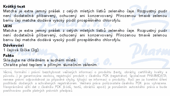 Matcha je extra jemný prášek z celých mletých lístků zeleného čaje. Rozpustný pudr není dodatečně přibarvený, ochucený ani konzervovaný. Přirozenou tmavě zelenou barvu čaji matcha dodává vysoký podíl prospěšného chlorofylu.