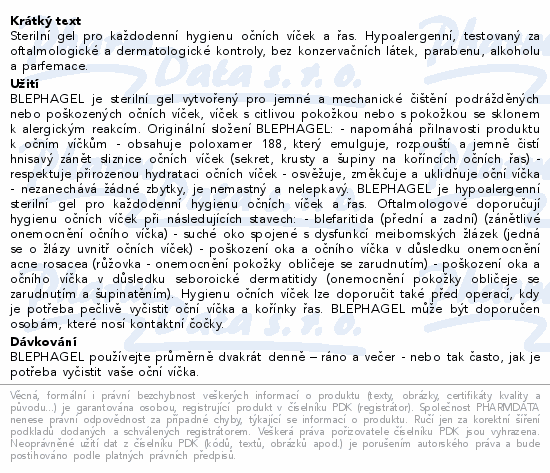 Sterilní gel pro každodenní hygienu očních víček a řas. Hypoalergenní, testovaný za oftalmologické a dermatologické kontroly, bez konzervačních látek, parabenu, alkoholu a parfemace.